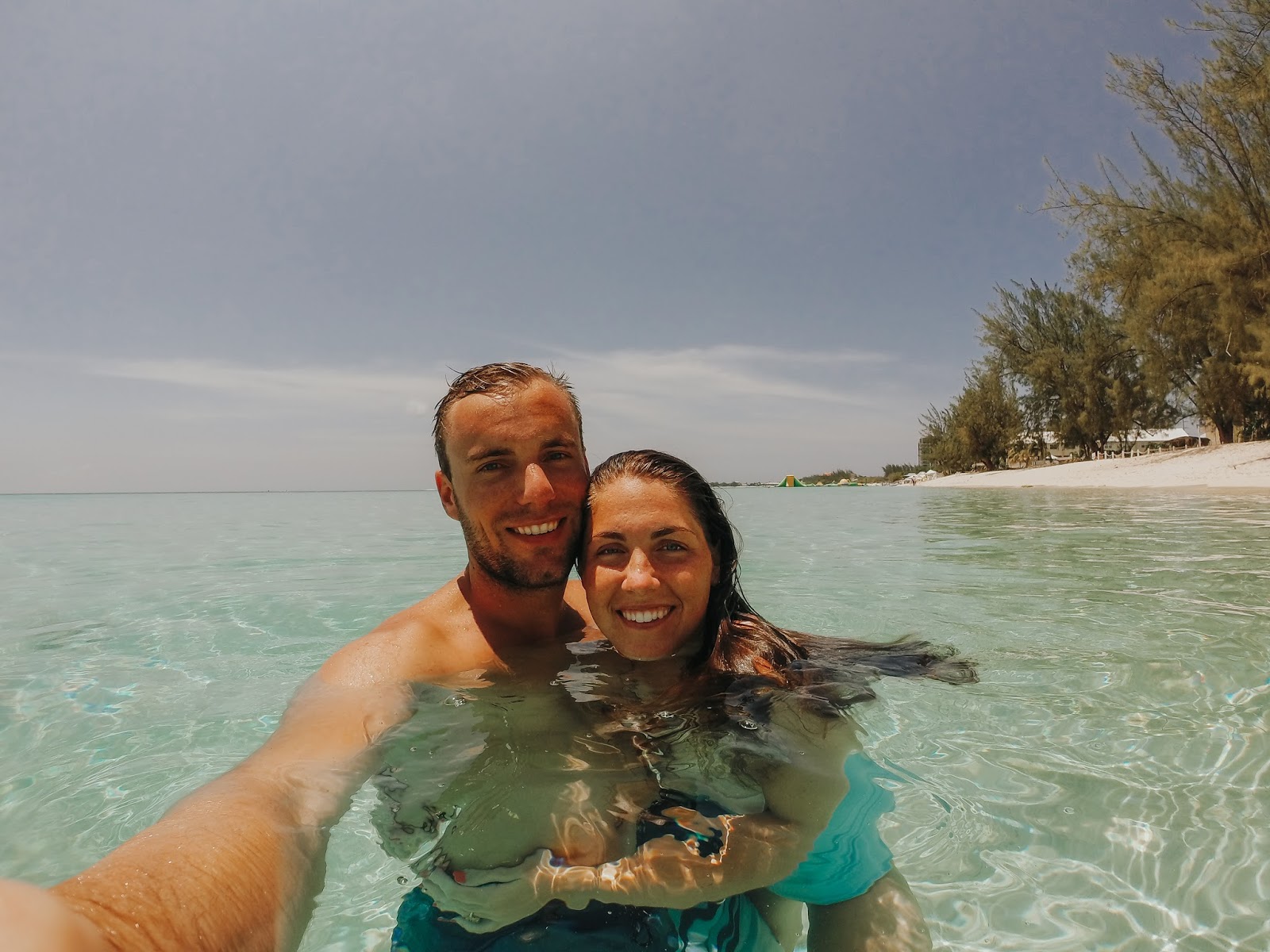 After we swam with the sting rays we headed back to our cruise ship to grab a quick bite to eat. Steven & Chloee's tour went a little longer than ours so we figured we had some time. We managed to meet back up with them, which was pretty awesome because we didn't have phones to use. We had walkie talkie's and we used them to find each other again! The four of us took the bus to get to Seven Mile Beach. There are lots of taxi's waiting to drive you to the beach from the cruise port. But they definitely rip you off and it's better & cheaper to take the bus! It's not a far drive at all, maybe 15 minutes?